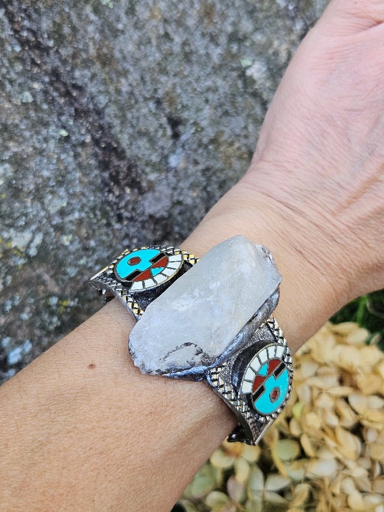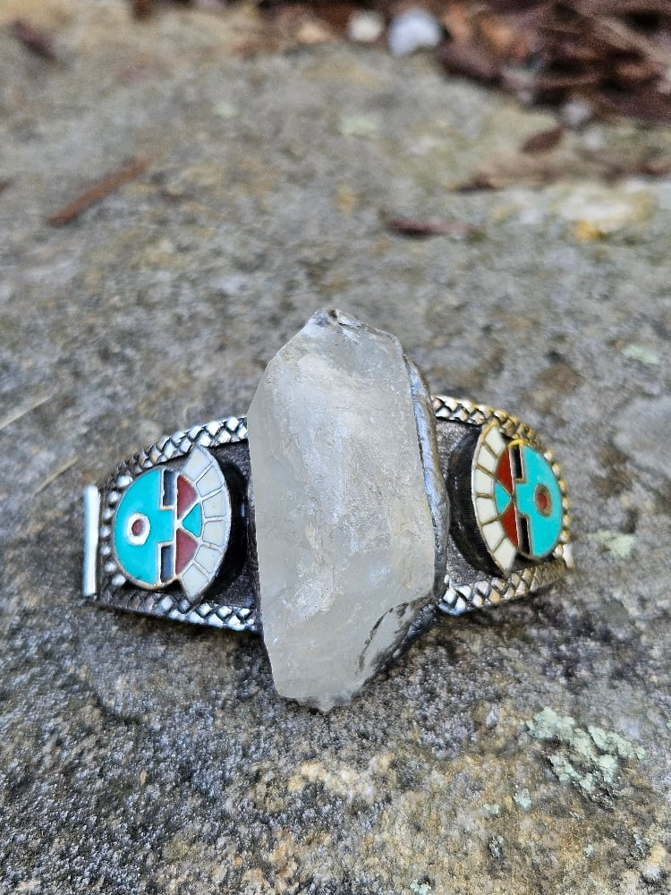 Vintage silver colored stretchy watch with Native American inspired images and a sculpted quartz