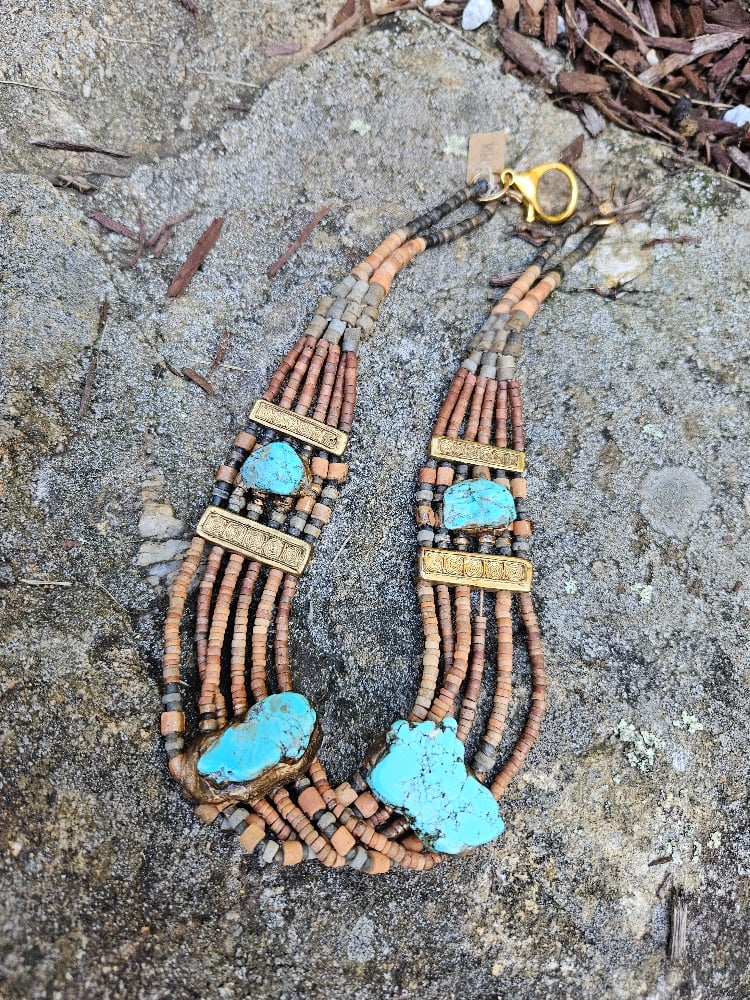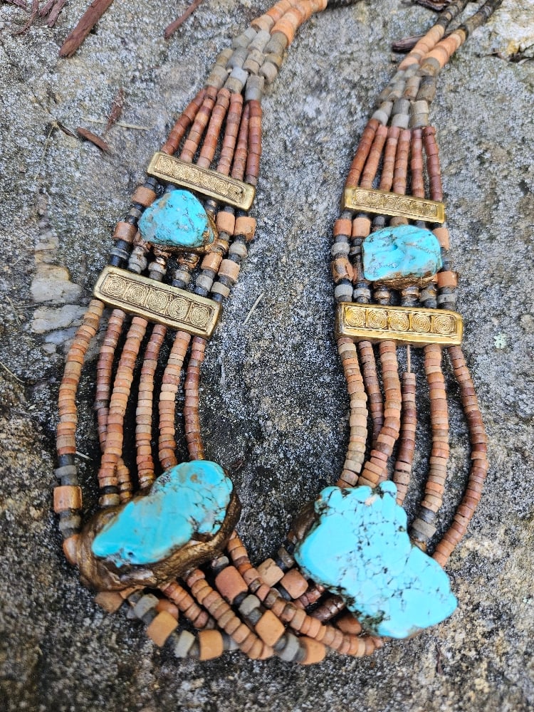 Upcycled wooden beaded bib style necklace with sculpted turquoise dyed hematite.